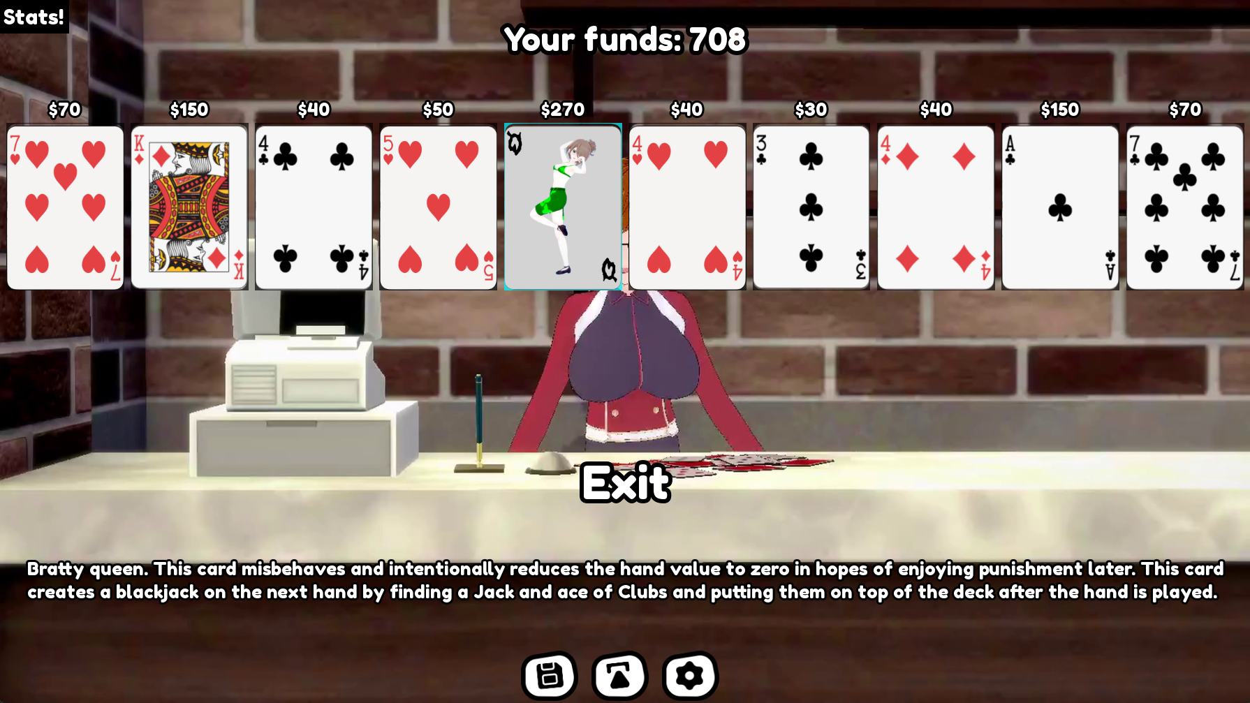The game has a lot of potential, however the endless 21 and an unending lust state from the opponent does make the run an instant loss in general with the absurd amount of lust stacks that can accumulate at 1 given time. even having escape artist has no effect when the lust state is past a threshold (having to draw 4 or more cards just to attempt escape) (chalk upgrade no help as well)